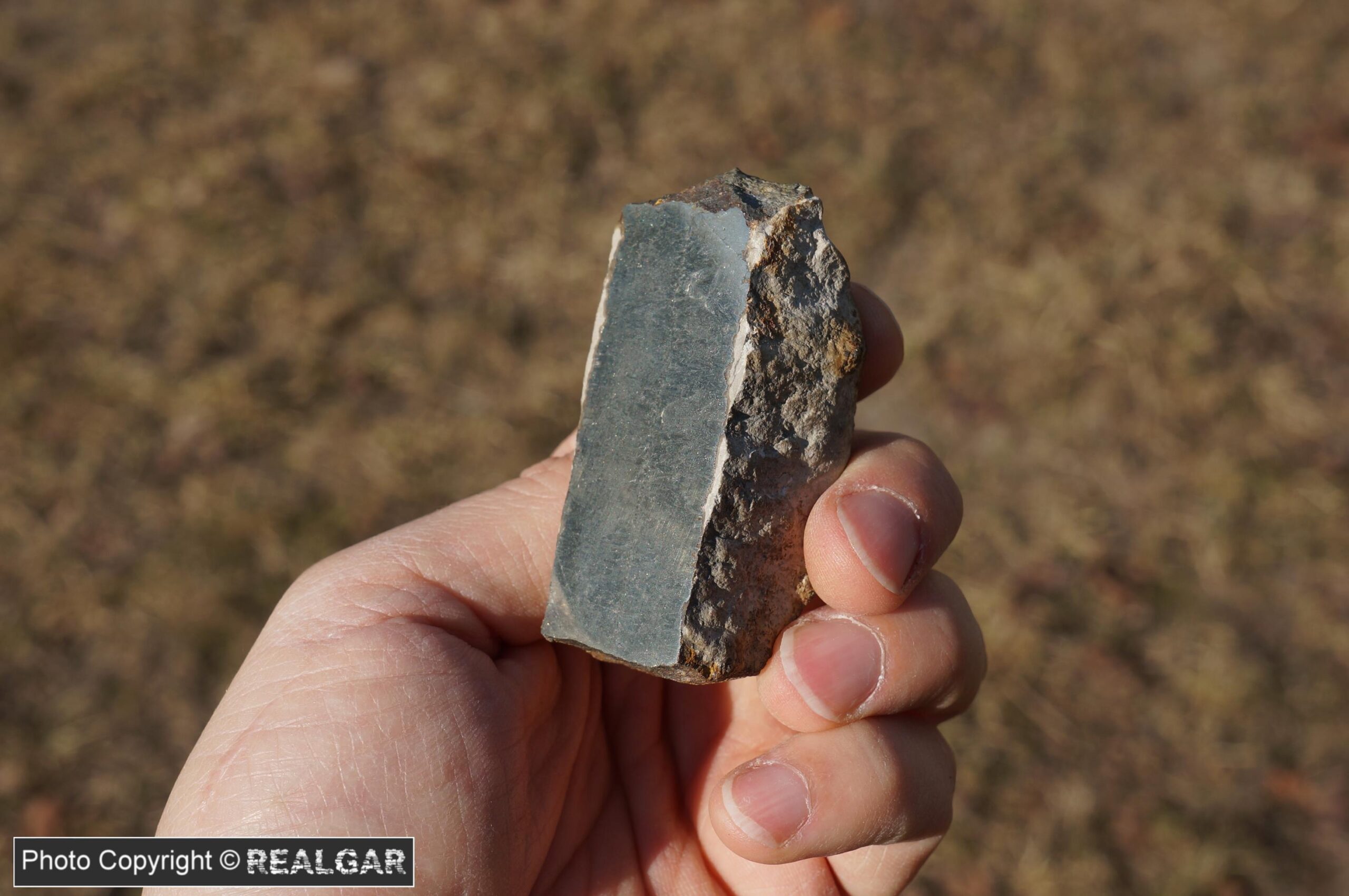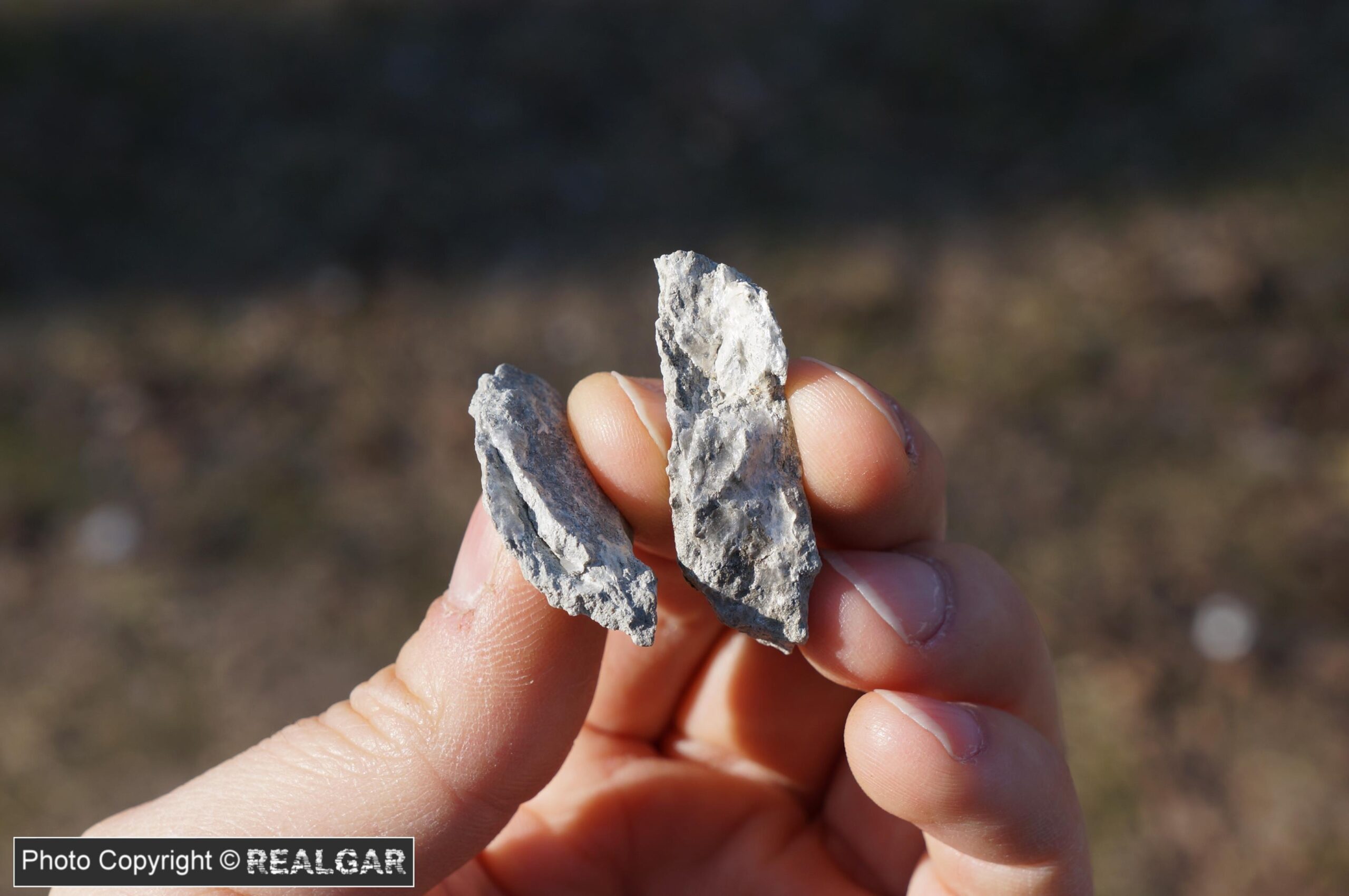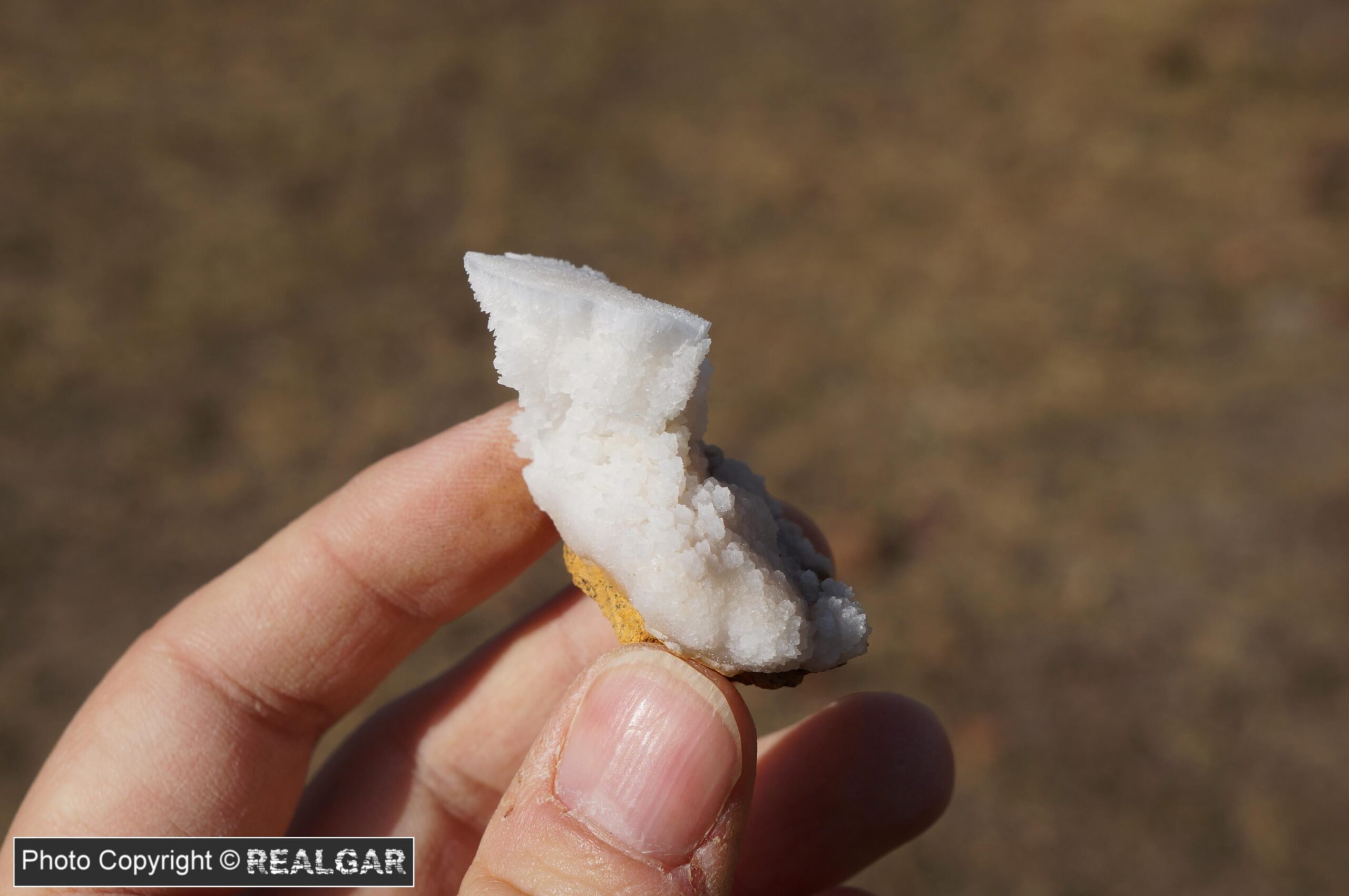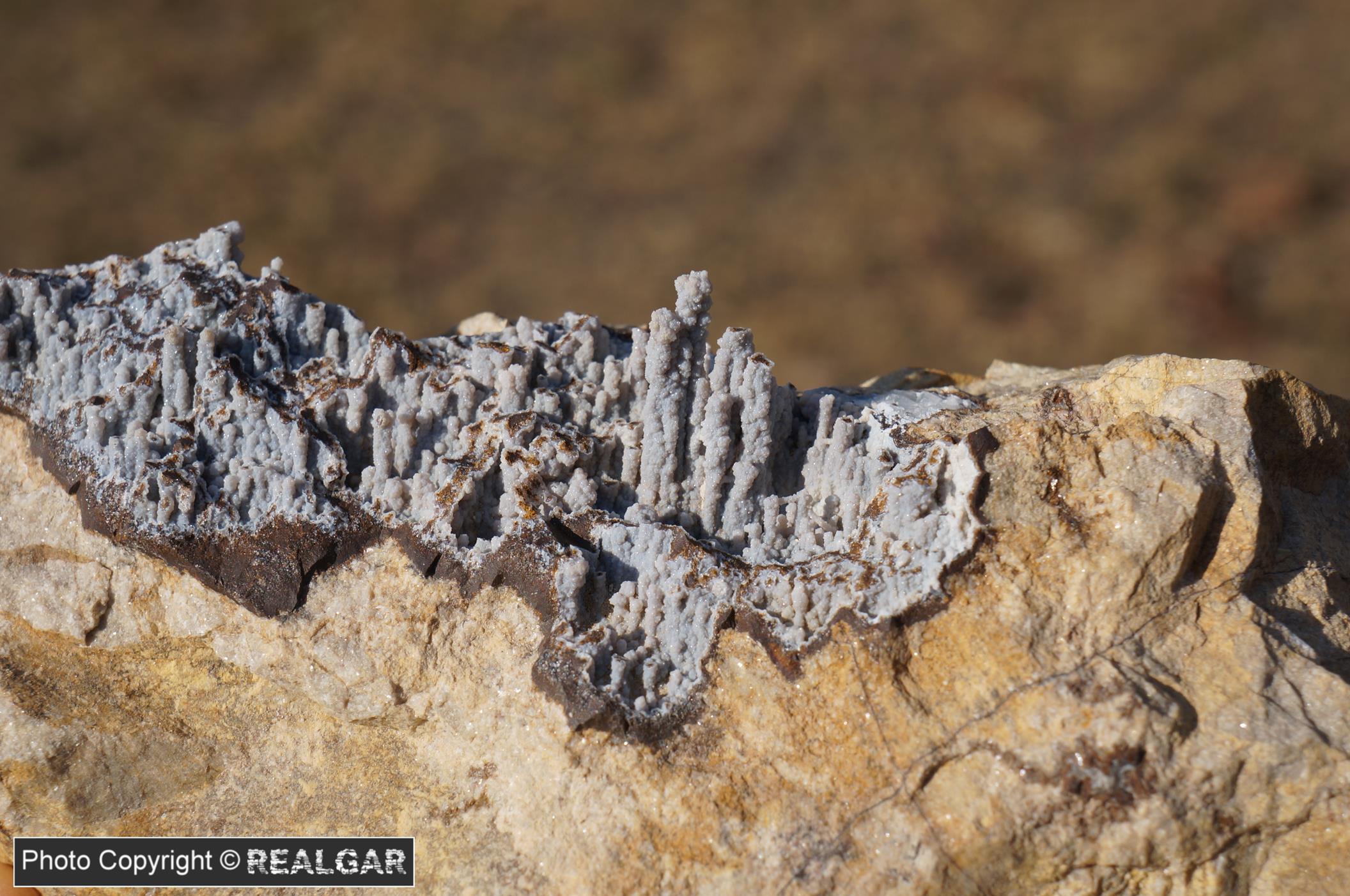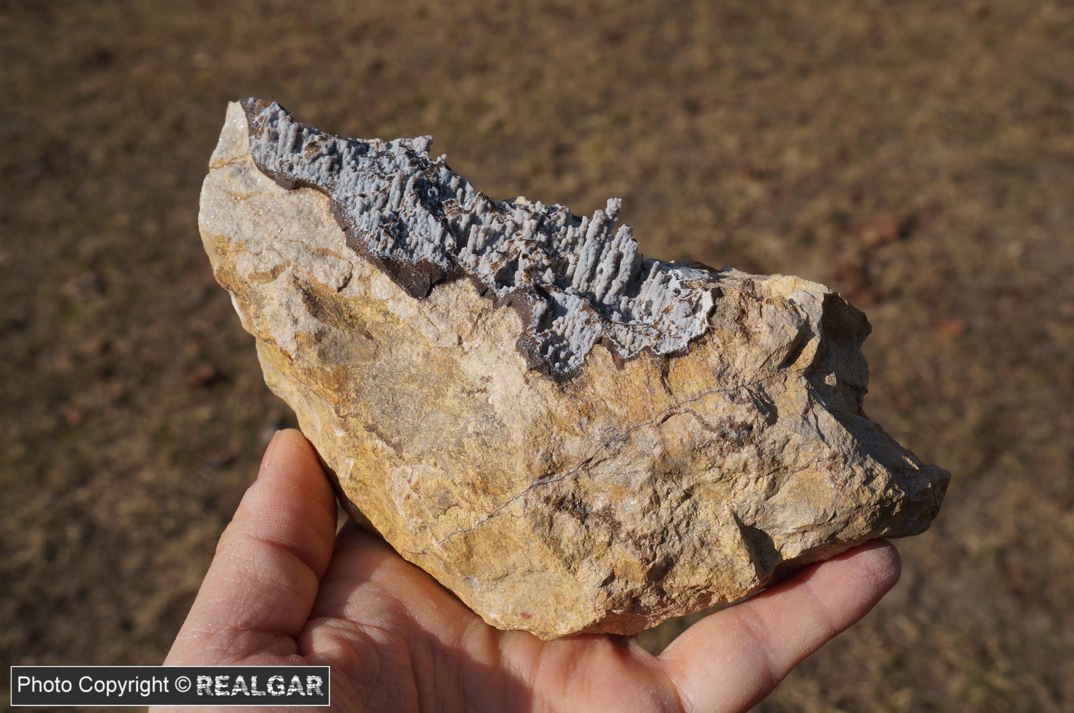 Pierwszy z dwóch prezentowanych tutaj okazów, które przywiozłem z kopalni dewońskiego wapienia i dolomitu Józefka. Chalcedon w tej odkrywce nie był może tak dużym zaskoczeniem, jak jego szare, wpadające w błękit zabarwienie. Na uwagę zasługuje też wykształcenie; rurkowate skupienia (puste wewnątrz), pseudostalaktyty przypominające formą np. te popularne okazy z Sidi Rahal. Z kilkunastu przywiezionych okazów, ten zostaje w kolekcji.