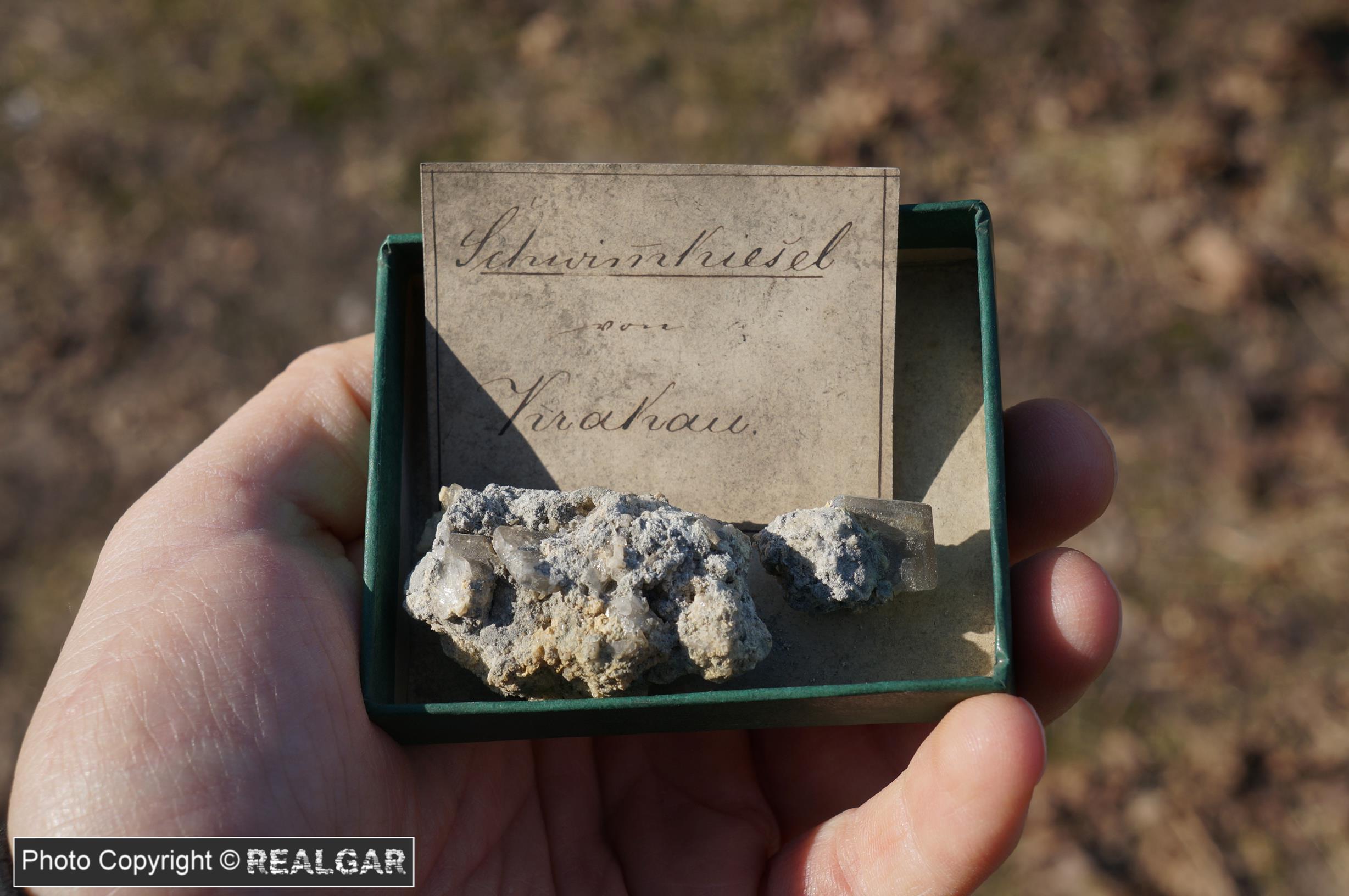 Wszystko co związane z dawnym górnictwem siarkowym Swoszowic biorę w ciemno. Do kolekcji wpadają dwa okazy barytu z tej historycznej lokalizacji. Dwa…bo jak kupowałem był to jeden okaz, ale niestety w ucierpiał w transporcie. Sam kryształ prawdopodobnie zostanie jak jest, ale drugi z okazów wymaga preparacji i odsłonięcia tabliczkowych kryształów. Okaz z starą etykietą.