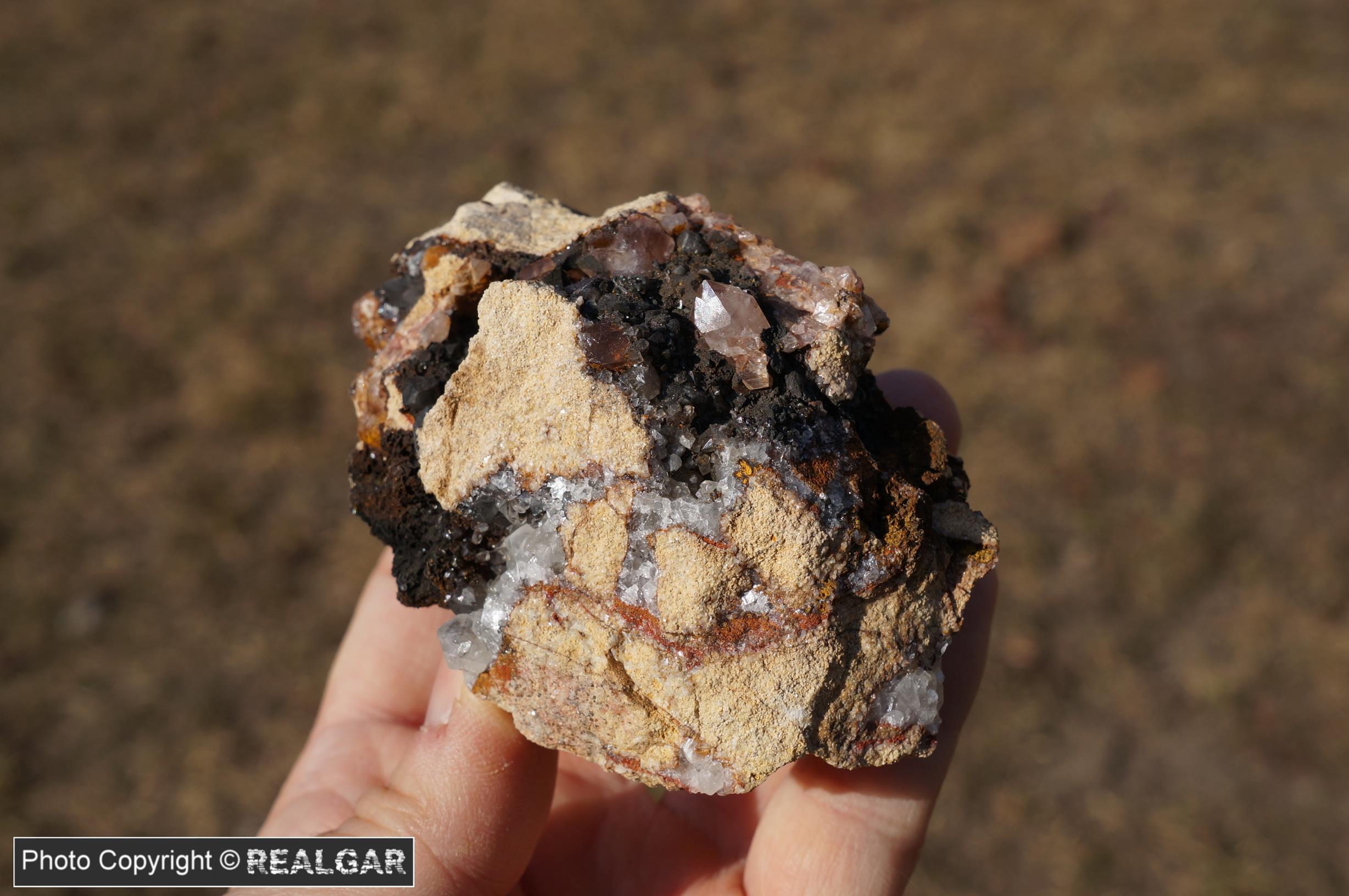 Najczęstsze w kolekcjach minerały z tej historycznej lokalizacji jaką jest kop. Trzebionka w Trzebini to galena, sfaleryt czy cerusyt. Taki zestaw jest też tutaj; sam okaz jest atrakcyjny i na pierwszy rzut oka można nie zauważyć czym tak naprawdę jest obiekt zainteresowania. Te wiśniowo rdzawe naloty, które można pomylić z hematytem, to selen rodzimy. Okaz po identyfikacji u dr Eligiusza Szełęga.