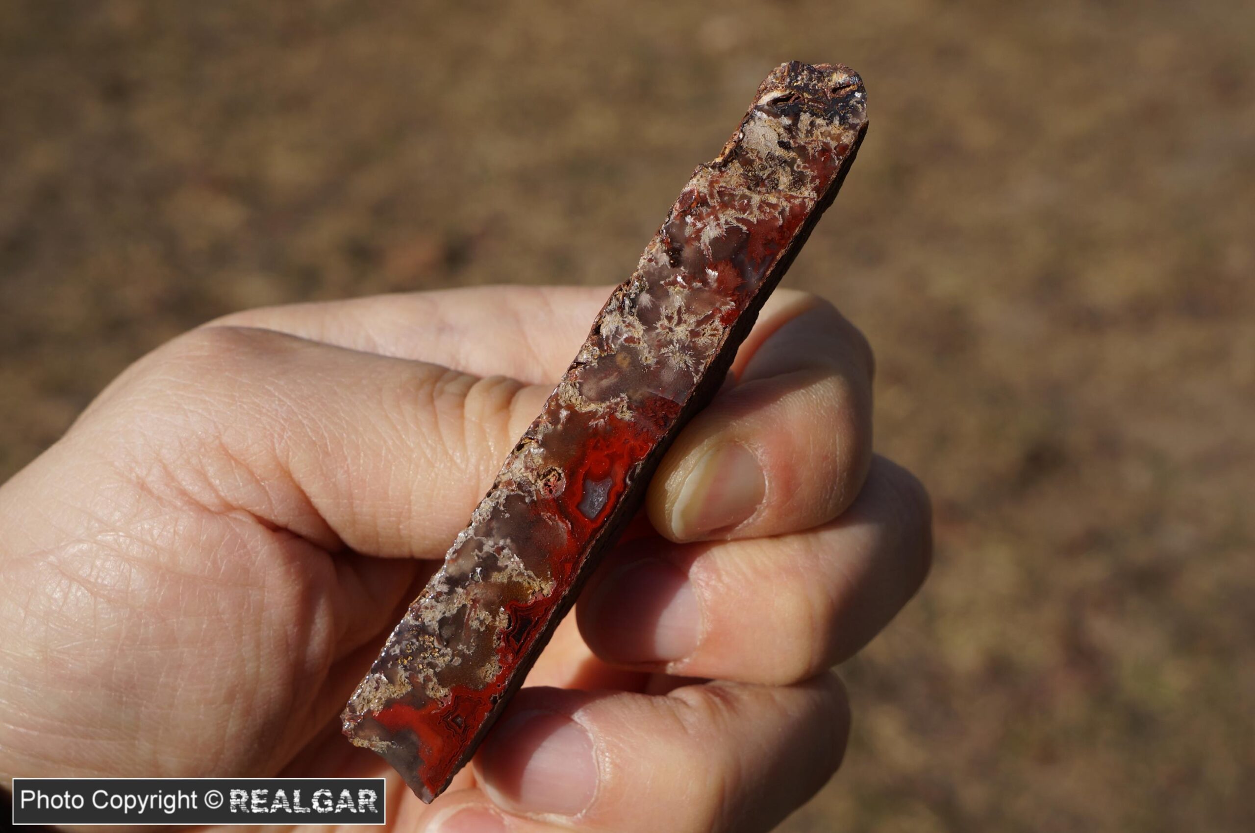 Agat szczelinowy ze znanej lokalizacji niedaleko Lwówka Śląskiego. Tak jak większość okazów z tej lokalizacji i ten ma niewielką miąższość, chociaż nadrabia całkiem ładnym rysunkiem. Fajny okaz jak na pierwszy z tej lokalizacji.