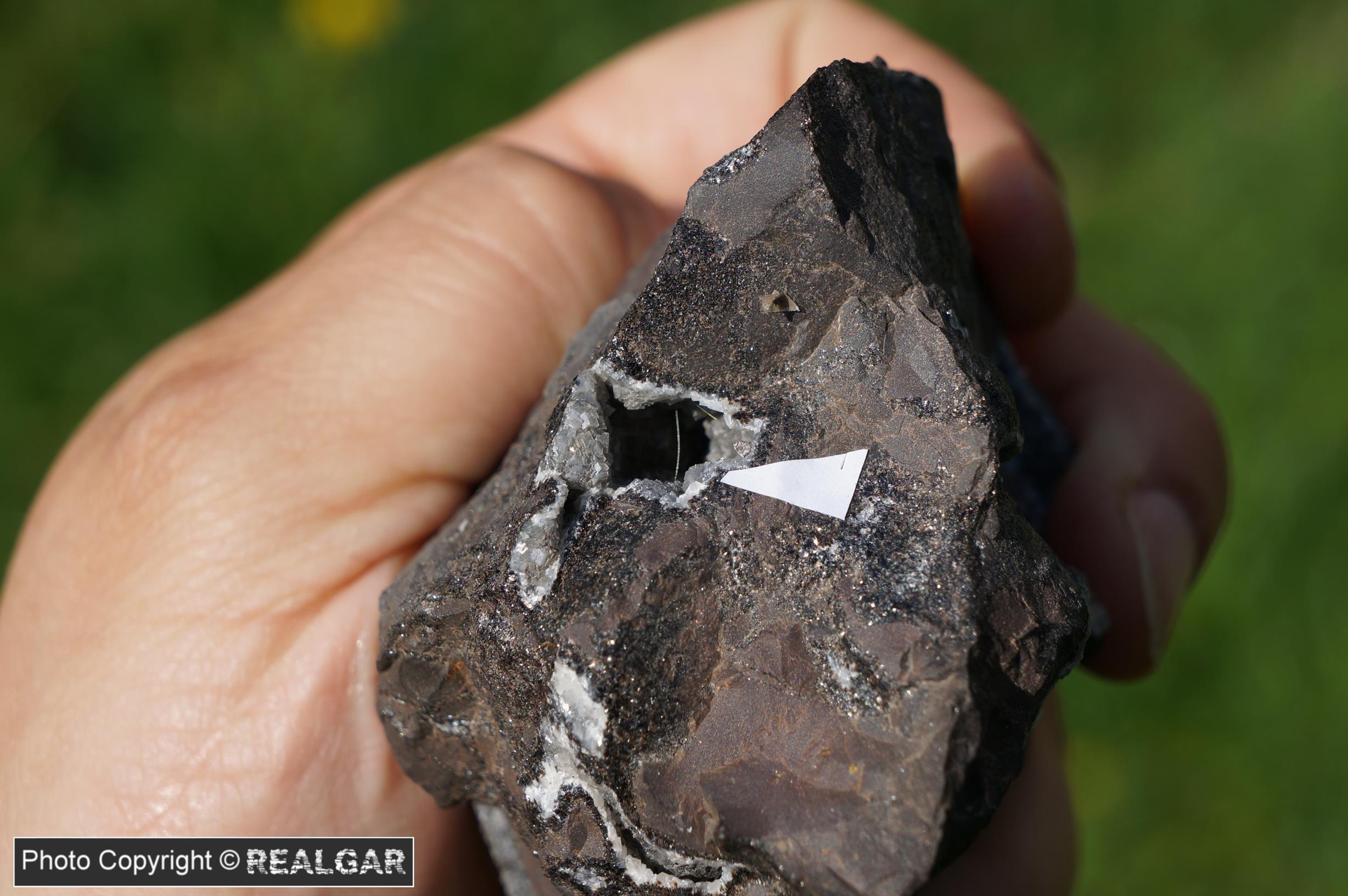 Uwielbiam te ledwo widoczne „nitki” millerytu, które czasami można znaleźć wśród syderytów na hałdach górnośląskich kopalń. Jestem pewny, że gdyby rozbić tę skałę, wewnątrz mógłby być przynajmniej jeszcze jeden kryształ (pustka ciągnie się dalej). Niestety to ten typ okazu, że ryzyko może się nie opłacać. Kryształ widoczny na zdjęciu musiałby po prostu wypaść.